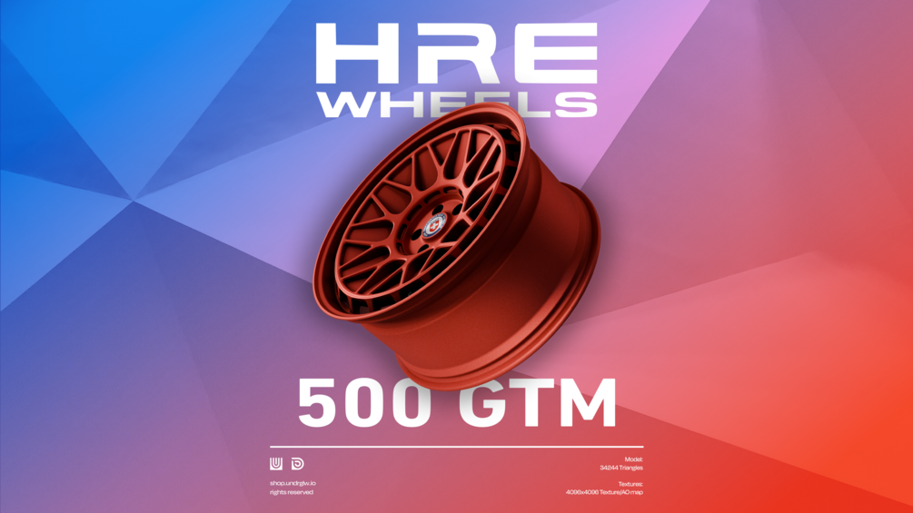 HRE - Vintage 500 GTM | 3D ModelundrglwHigh quality photomatched 3d model of the HRE Vintage 500 GTM€6+6eurFrozen RedContains the Frozen Red variant of the wheel, which is the version in the pictures.€10+10eurExtra ColorsContains (almost) every standard color offered by HRE as textures (Color, Roughness, Metallic and Normal)26eurName a fair price:€I want this!5 salesHRE - Vintage 500 GTM | 3D ModelAdd to wishlist New wishlistShareShare on XShare on Facebook Copy linkCopy product URL